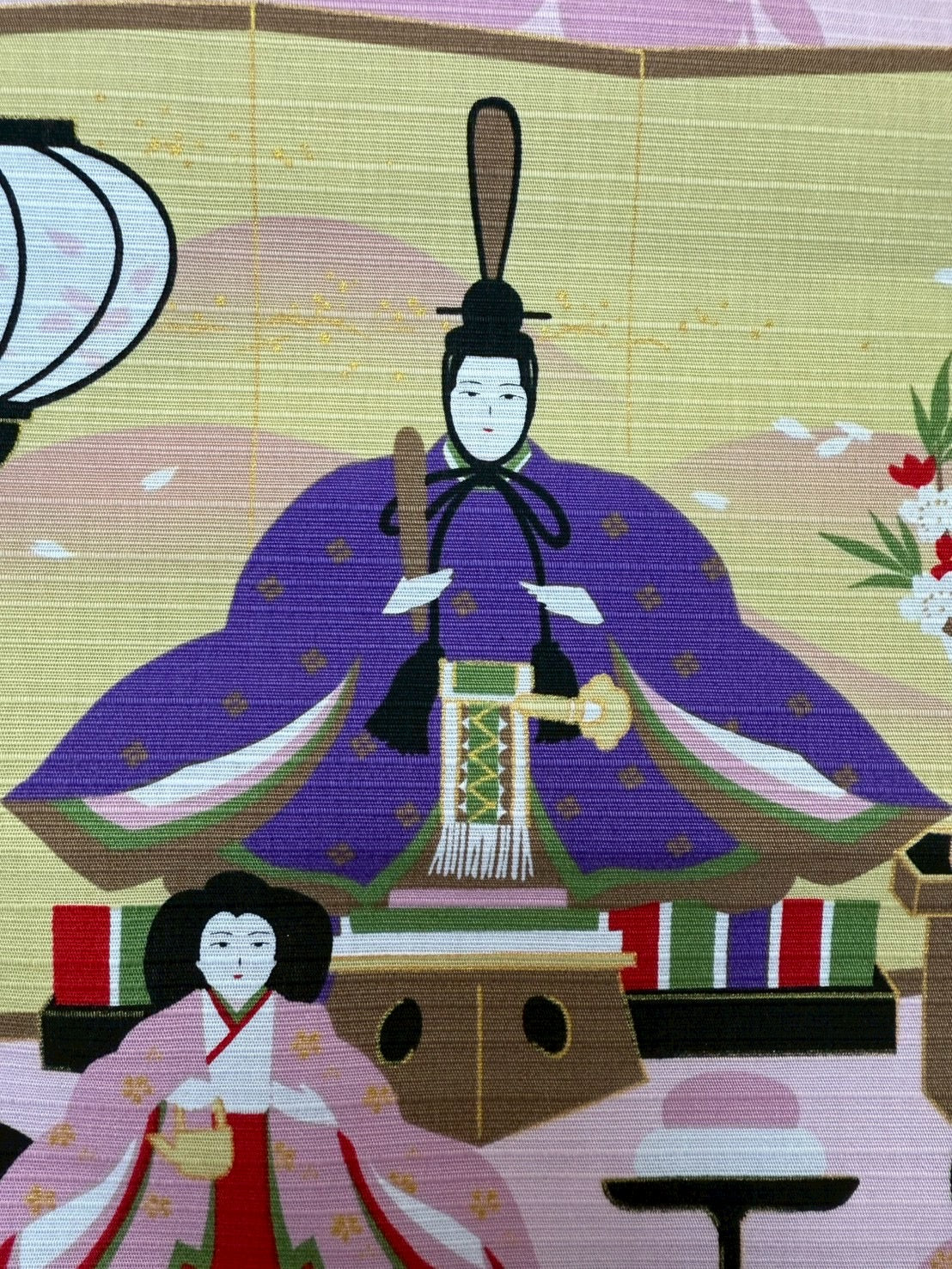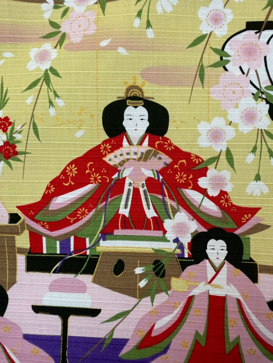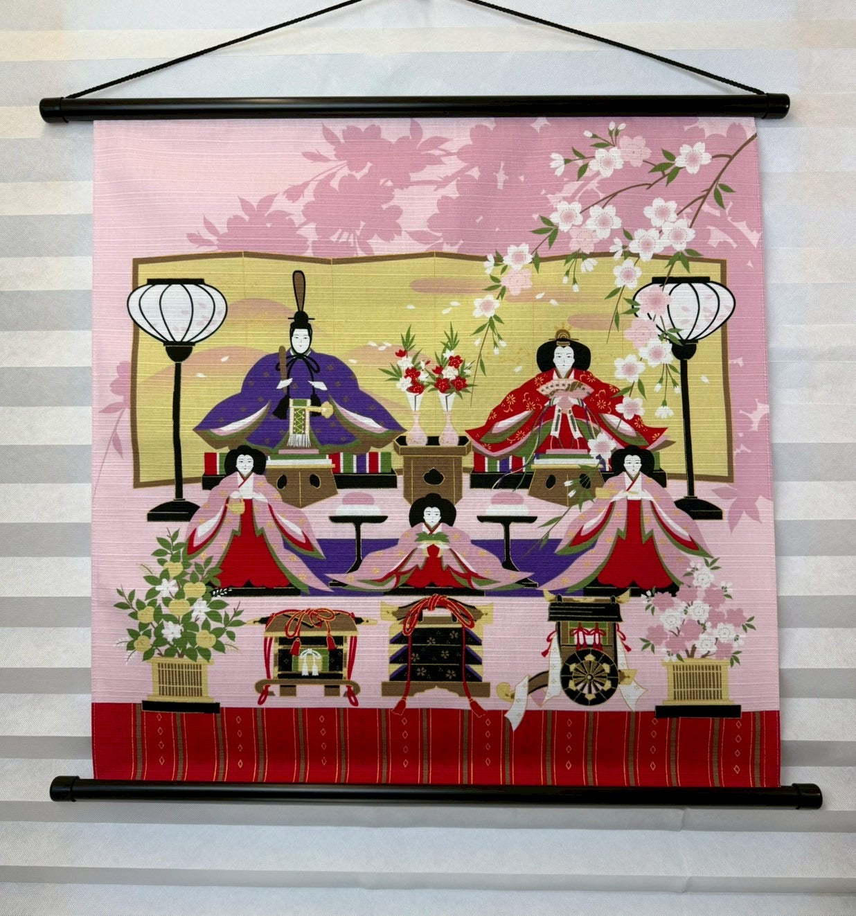 華やかな段飾りのお雛様を中心に、そっと差し込む桜の影をあしらった、春の気配あふれる風呂敷です。内裏雛や三人官女など、ひな祭りを象徴する人形たちを丁寧に描きつつ、すっきりとした構図と上品な余白が生まれています。背景に落ちる桜の影が、春の光と風を感じさせ、優雅で静かな情景を演出します。