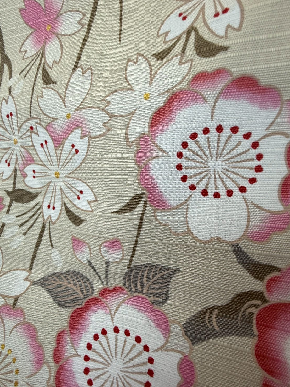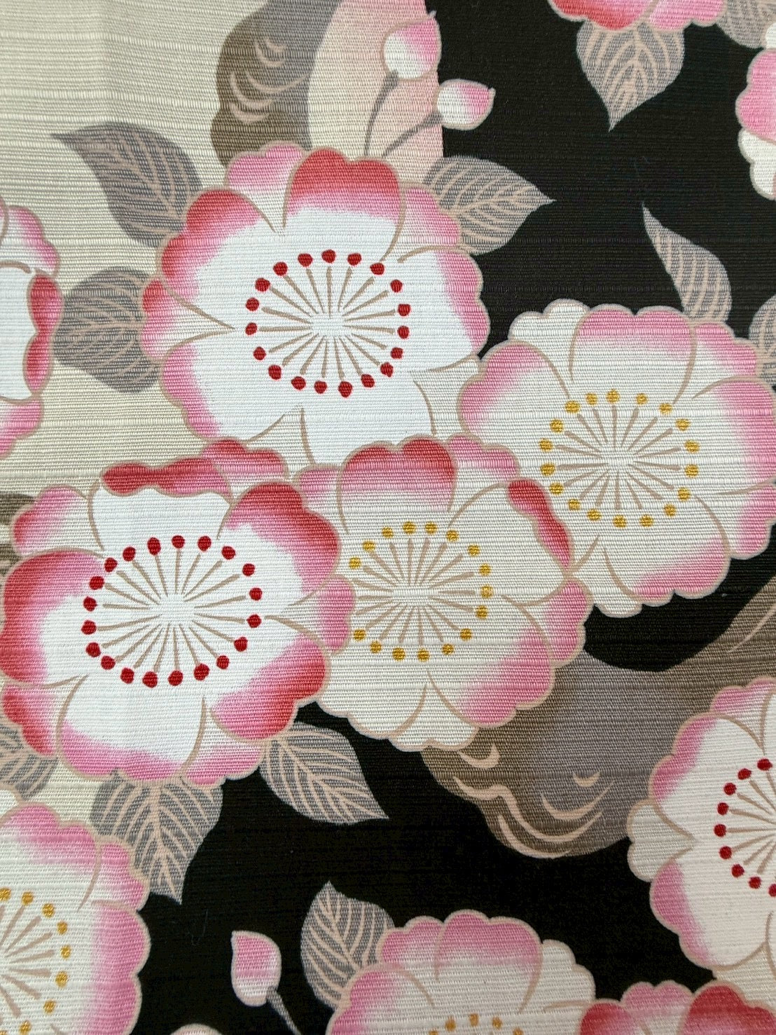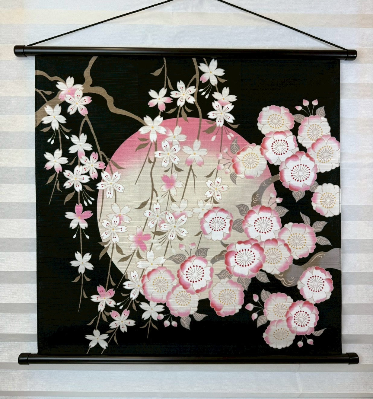 淡いソメイヨシノと華やかな八重桜を、深いブラックの背景に咲かせ、夜桜の幻想的な美しさを表現した風呂敷です。月明かりに照らされたような桜の色彩が黒地に浮かび上がり、静けさの中に凛とした華やぎが漂います。ソメイヨシノの繊細さと八重桜の重なりが、夜の空気感と調和し、上質でドラマチックな一枚に仕上がっています。