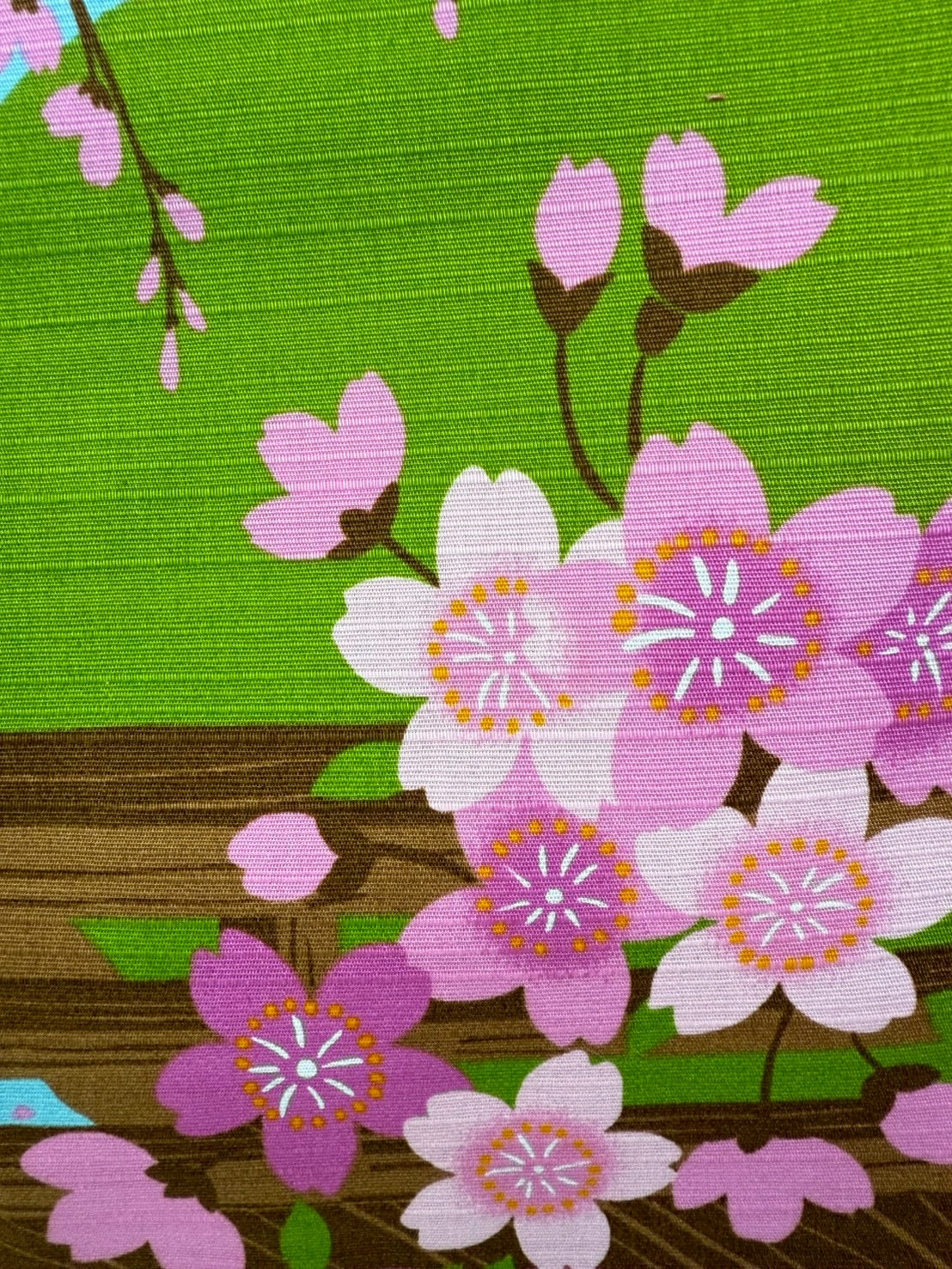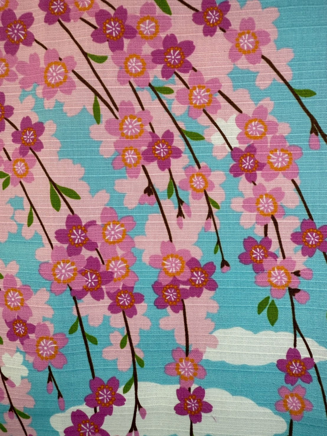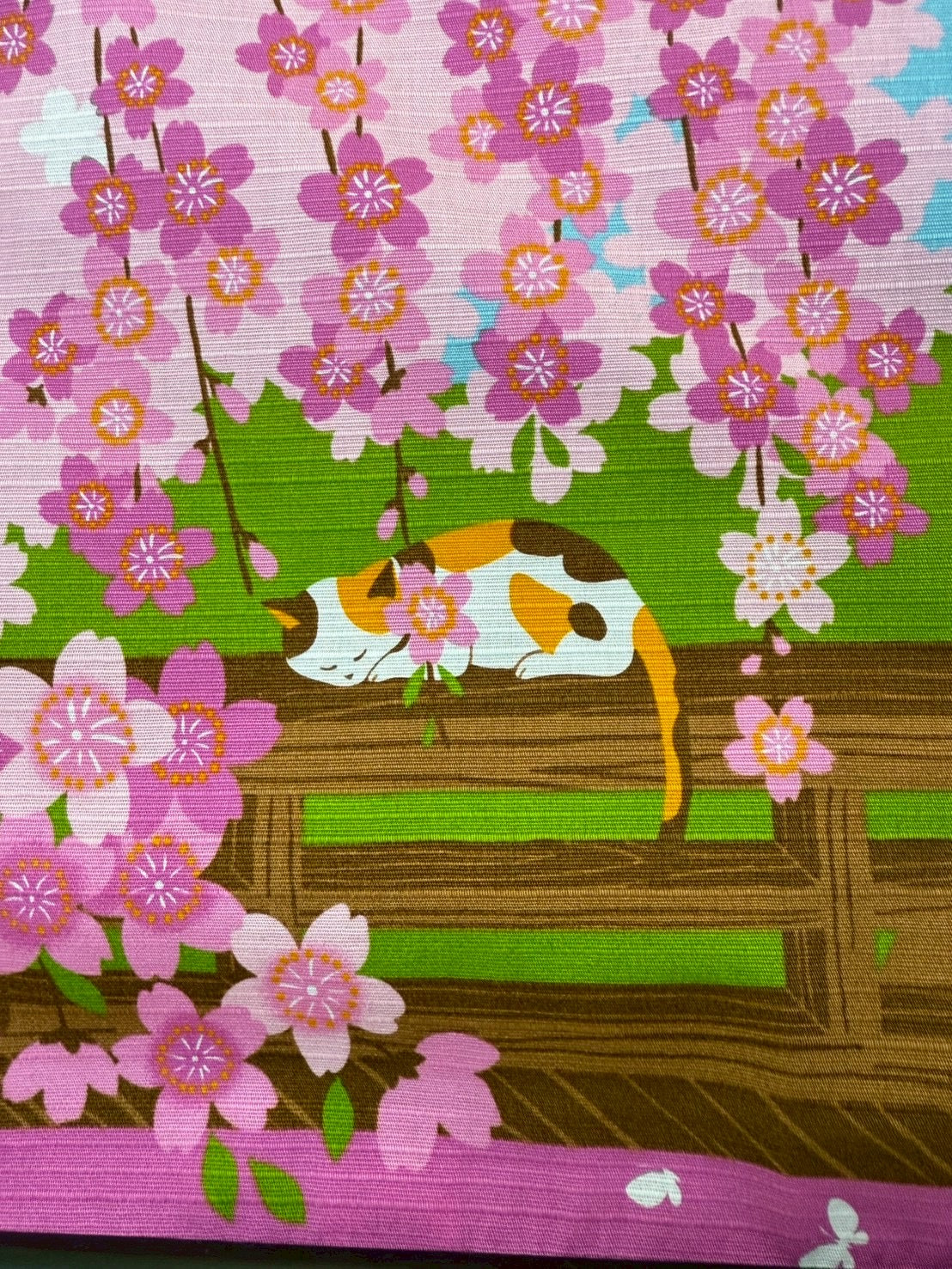 春の陽だまりの中、小川のほとりで三毛猫がうとうととお昼寝する、のどかで心和む情景を描いた風呂敷です。満開のしだれ桜が風に揺れ、花びらがふわりと舞い落ちる中、眠たげな三毛猫の姿がやさしい春の空気をそのまま閉じ込めたような一枚に仕上がっています。眺めるだけで気持ちがゆるむ、穏やかで可愛らしいデザインです。