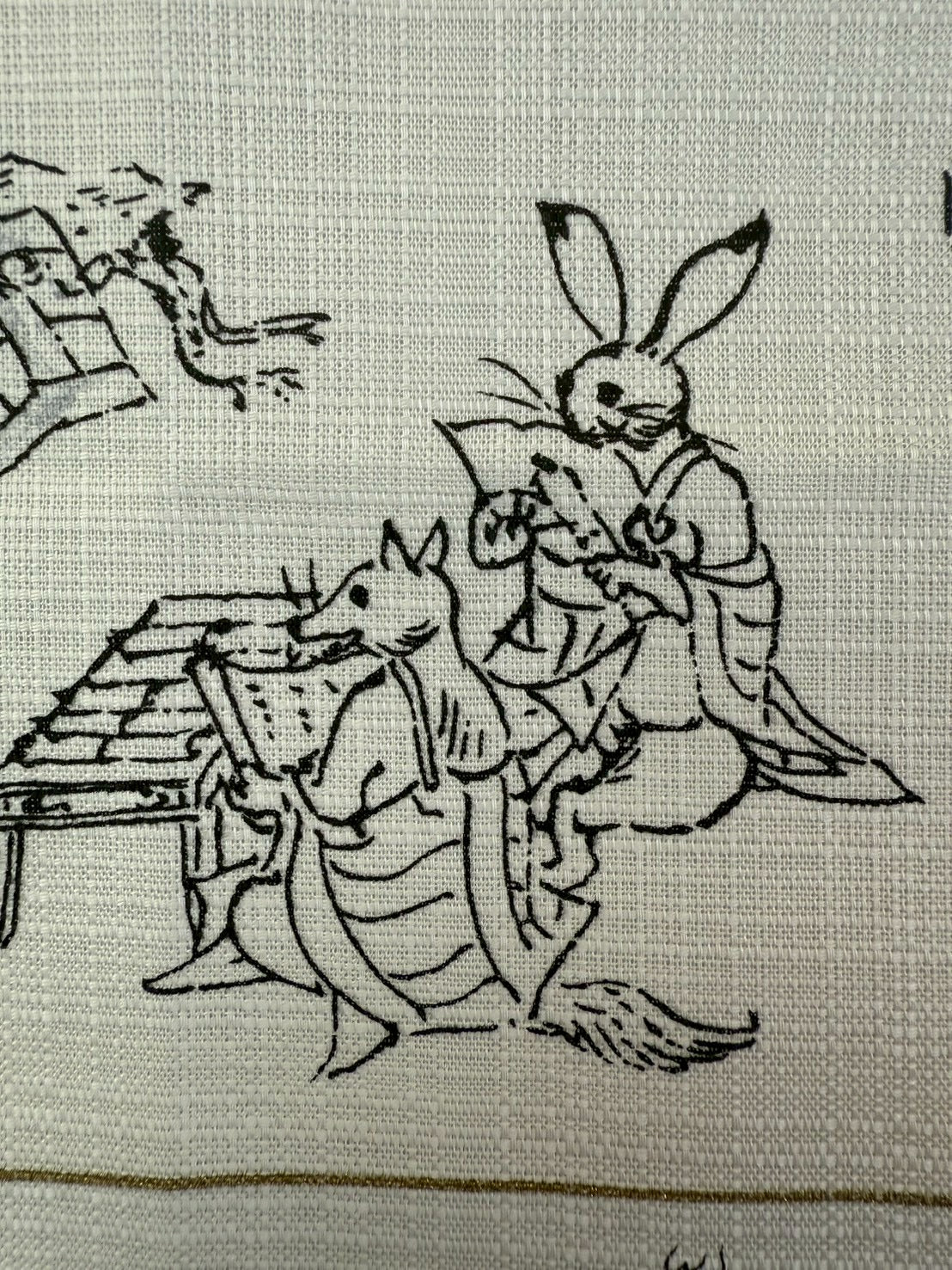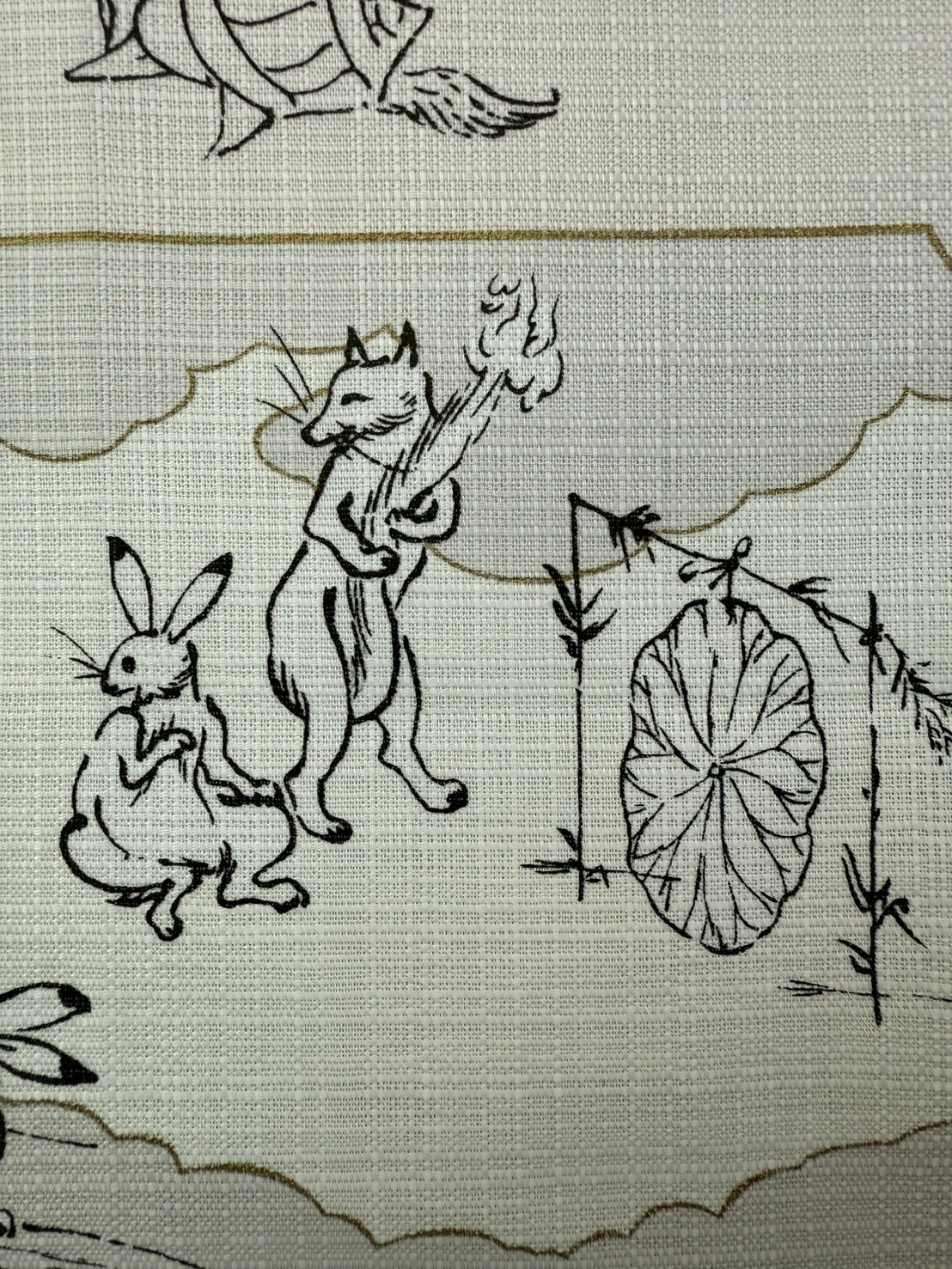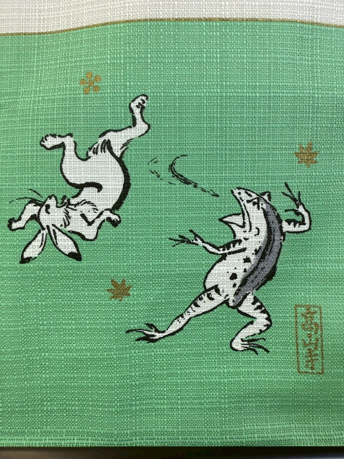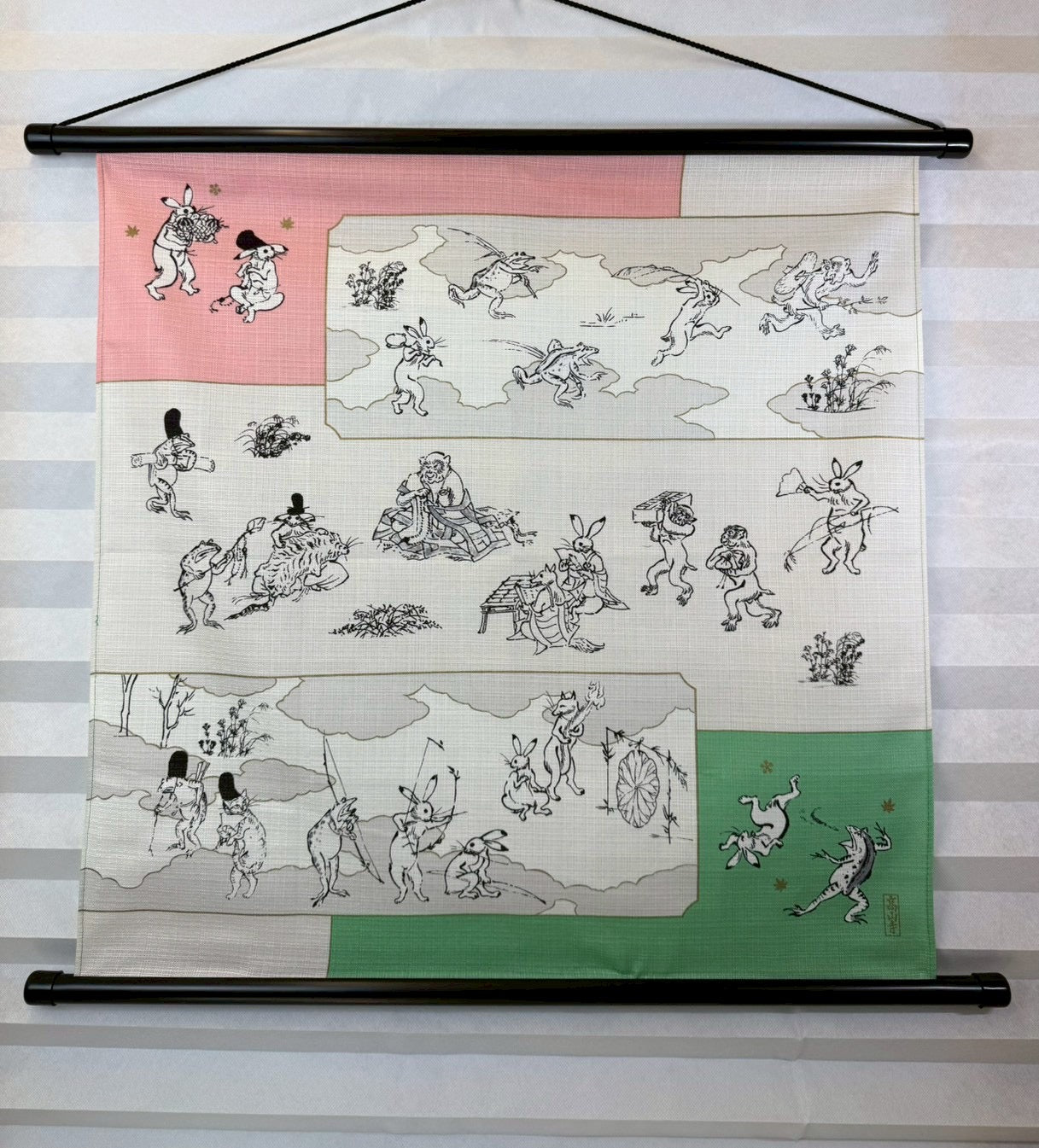 日本最古の漫画ともいわれる「鳥獣人物戯画」をモチーフに、動物たちが生き生きと遊ぶ姿を描いた風呂敷です。うさぎやカエル、猿などが人間のように振る舞うユーモラスな世界観が広がり、眺めるほどに物語が浮かび上がるような楽しい一枚。伝統的な筆致の美しさと、どこか愛嬌のある動きが調和し、和の魅力を軽やかに楽しめるデザインです。
