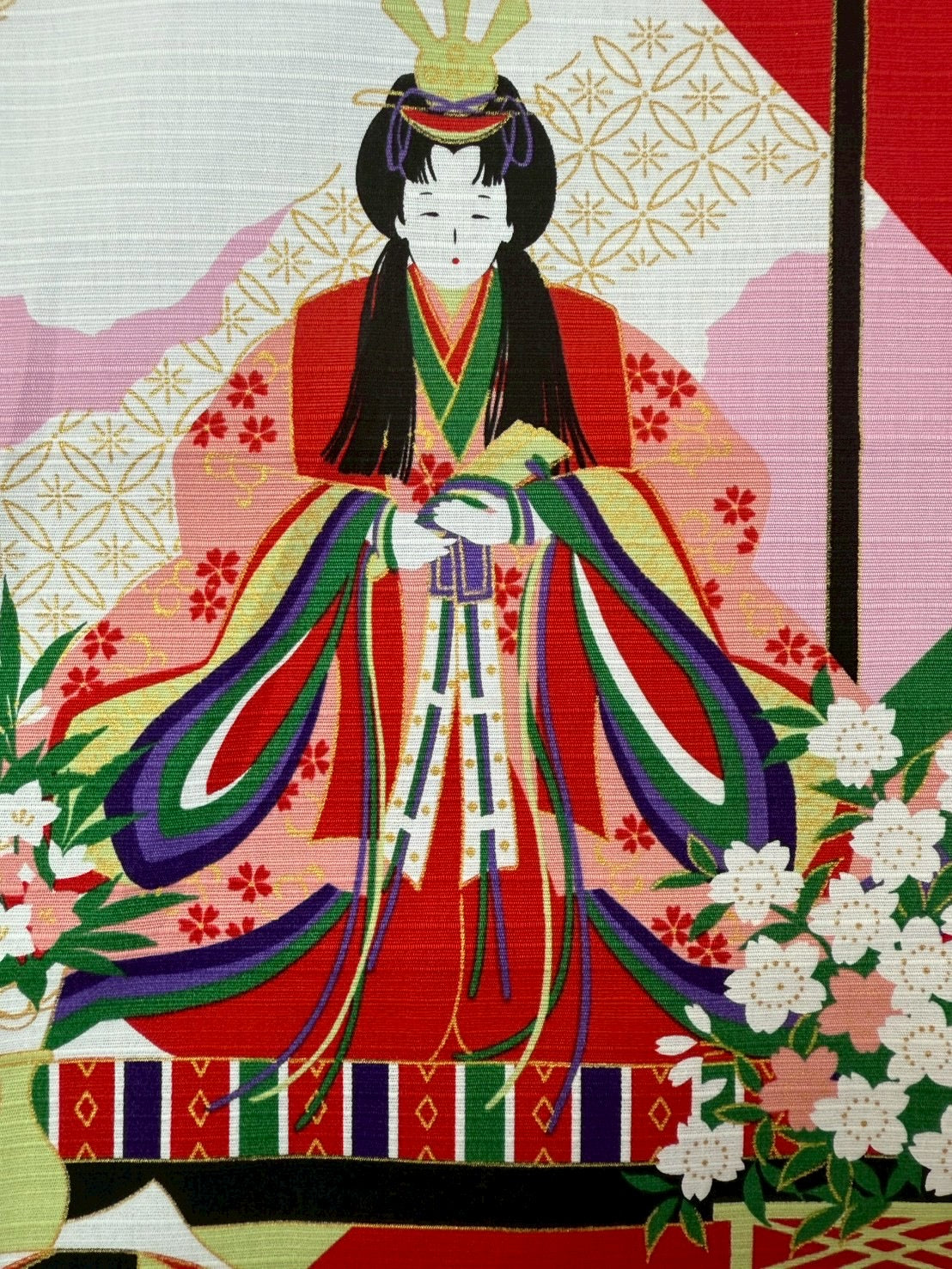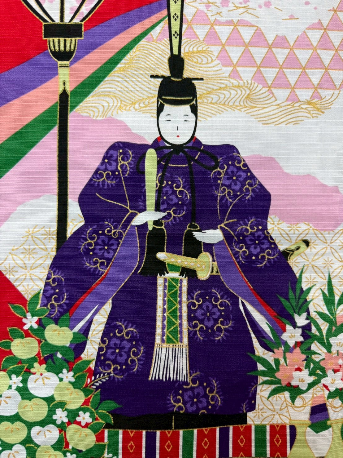 気品あふれる「みやび雛」を描いた、優雅で華やかな風呂敷です。繊細な表情のお雛様が、春の訪れとともに穏やかな幸福感を運んでくれます。江戸文様の繊細な意匠が、みやび雛の優雅さを一層引き立て、春の訪れを祝う特別な一枚に仕上がっています。